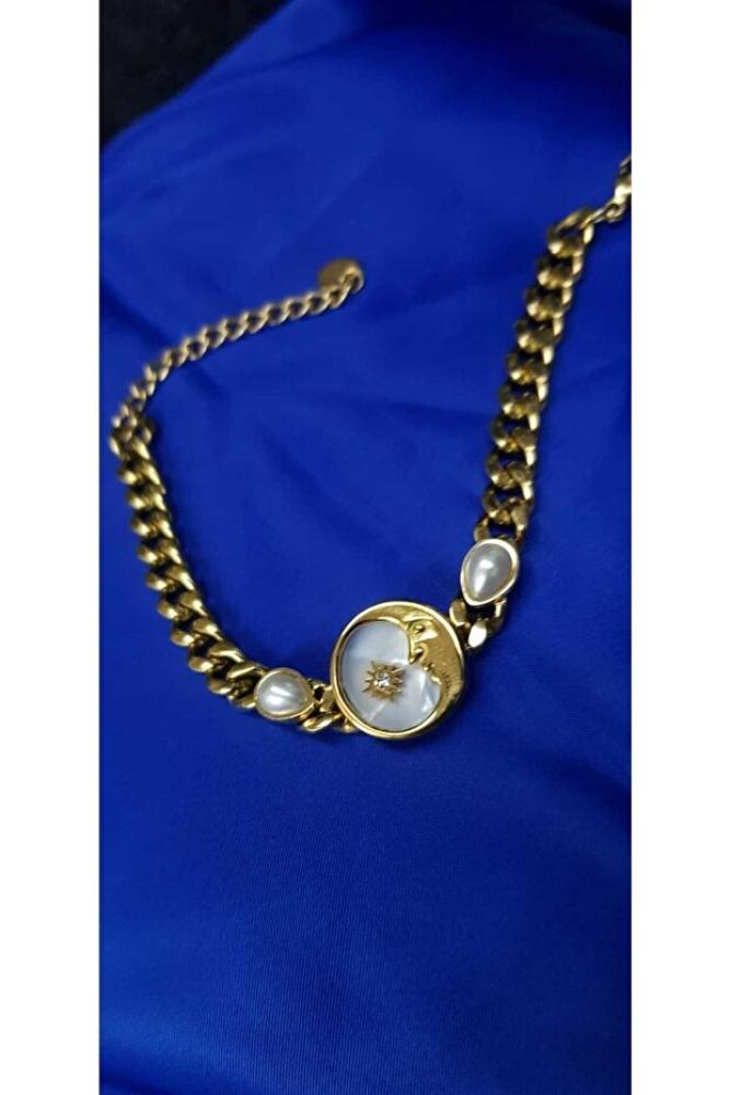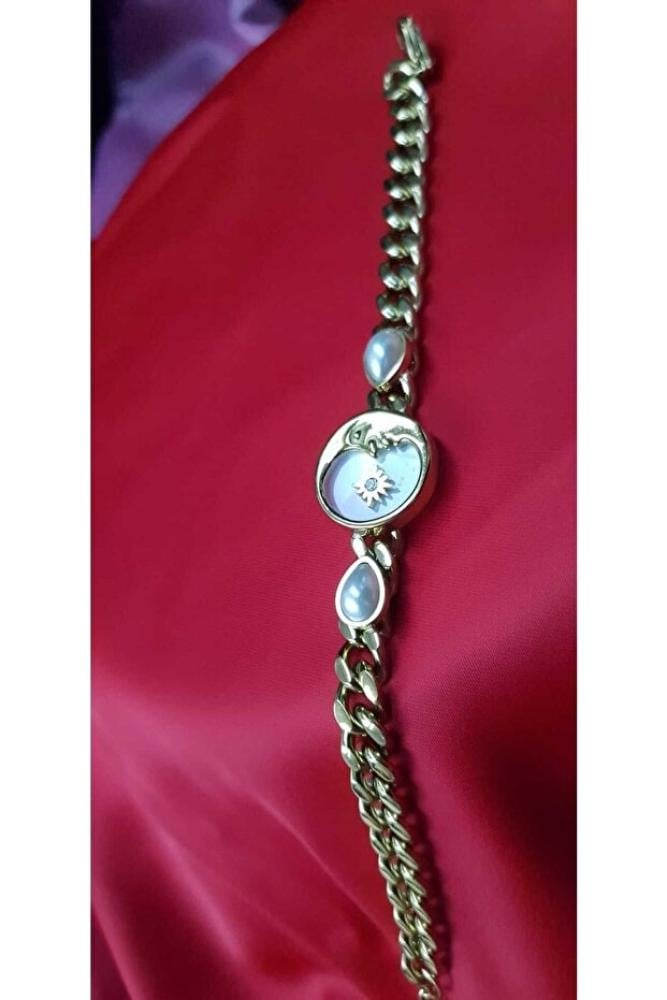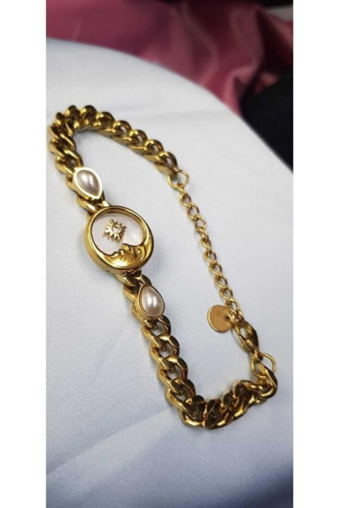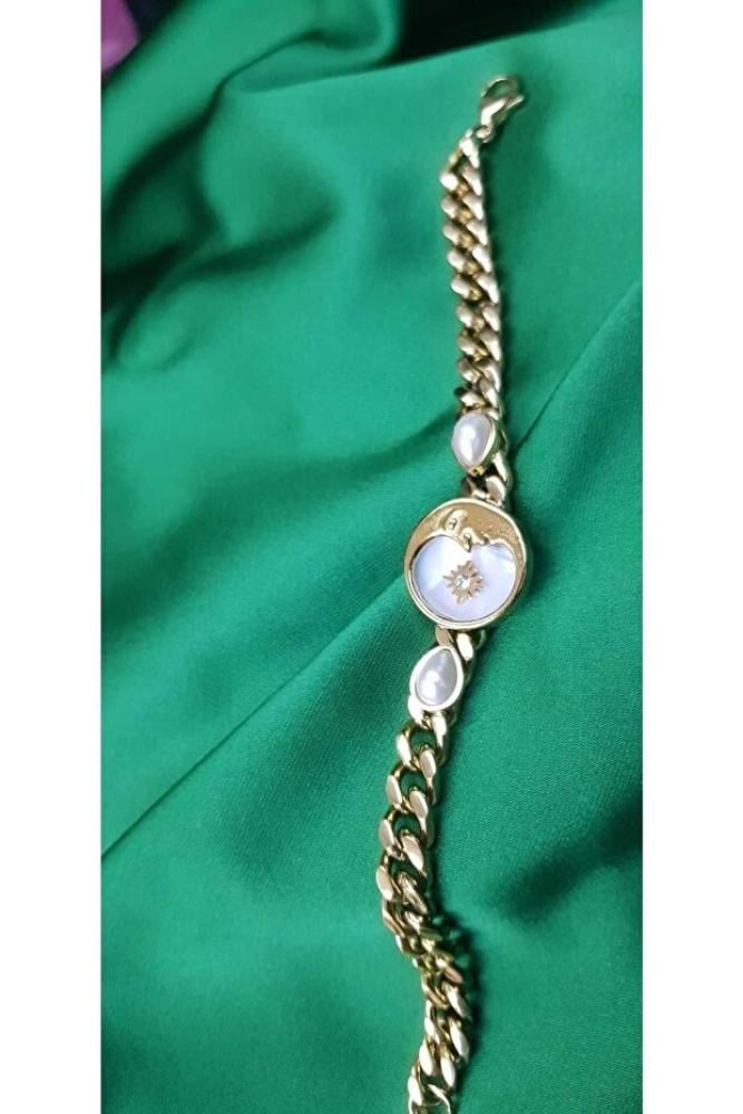 • اسم المنتج: سوار نسائي باللون الأصفر مزين بحجر القمر والنجمة واللؤلؤ