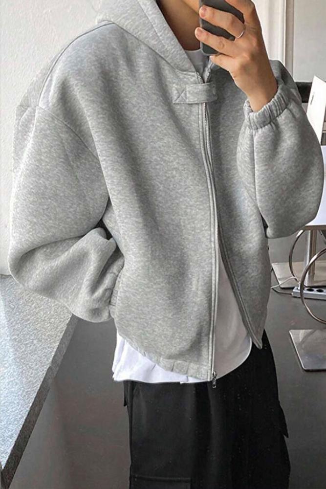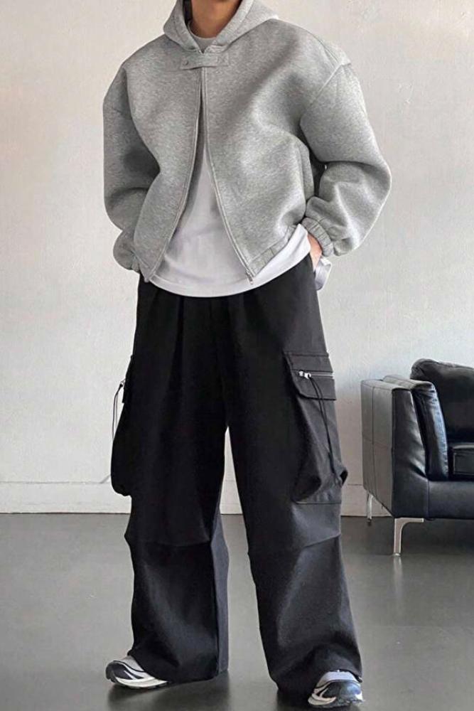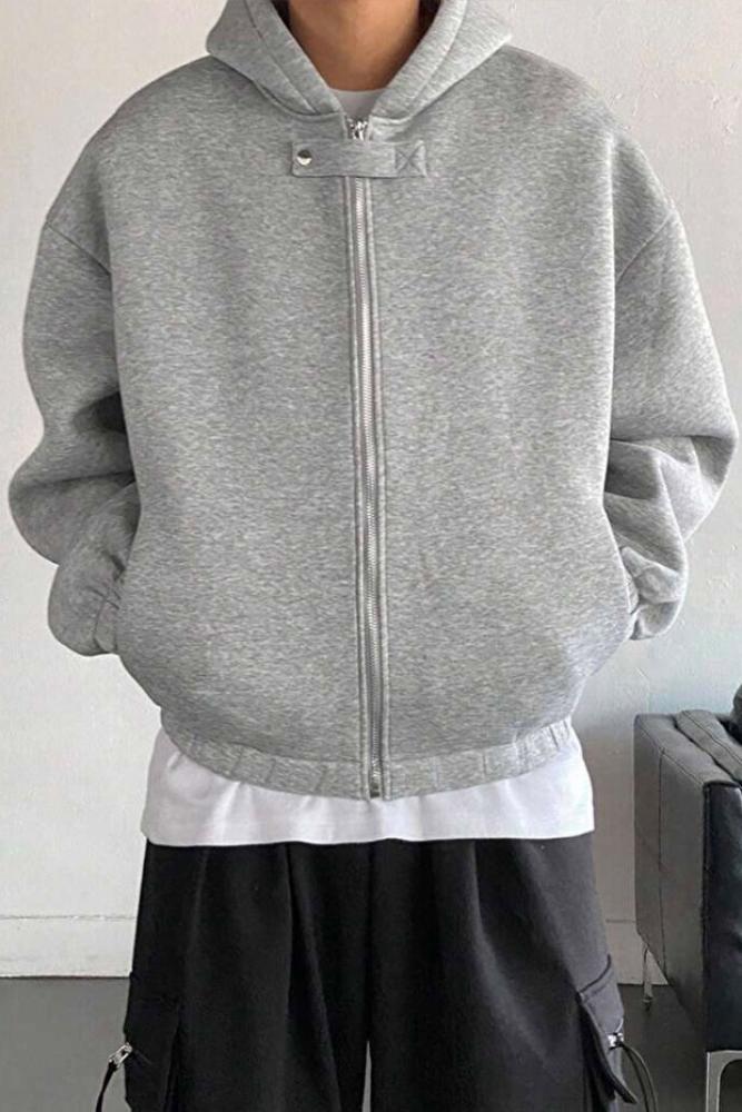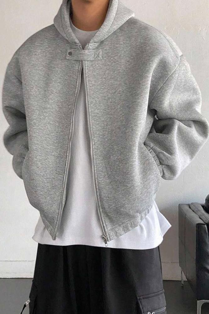 سويت شيرت رجالي كبير الحجم بزر أمامي وسحاب ثلاثي الخيوط باللون الرمادي
